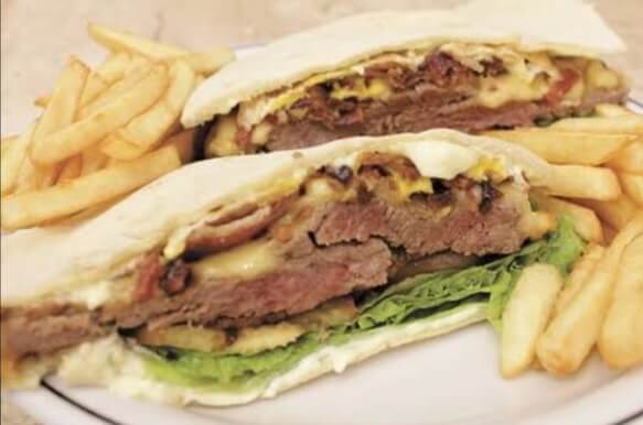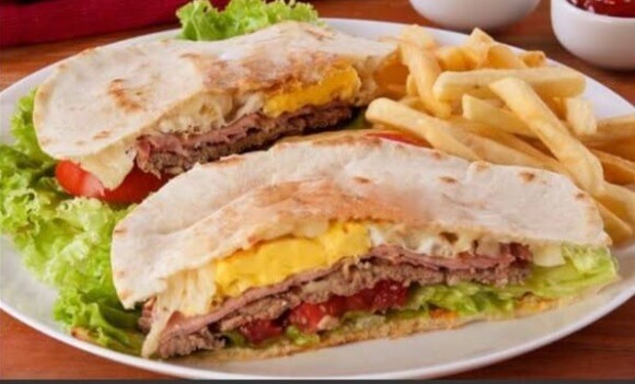 BEIRUTE DE CONTRA FILEPão sírio, 150gramas de bife , dois ovos fritos ,presunto sadia ,bacon , queijo prato , alface crespa , tomate, maionese temperada e batatas fritasR$ 42,00
